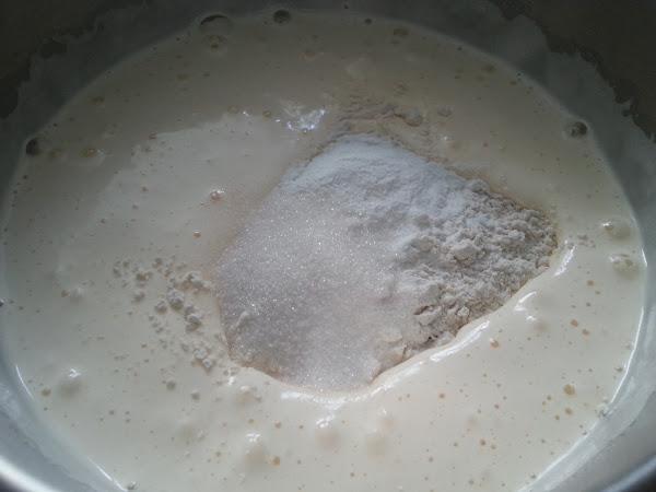 2- Añadimos la nata (crema de leche) junto con el aceite, la harina, la levadura, la vainilla y la pizca de sal, y batimos hasta que quede todo bien ligado.