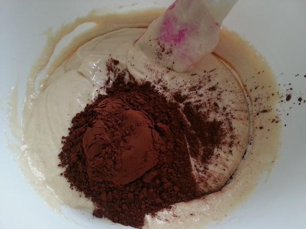 3. - Repartimos la masa en 2 boles, y a uno de ellos le añadimos el cacao y lo mezclamos bien.