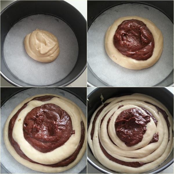 4. - En un molde engrasado o con papel de hornear (yo lo engraso también), vamos poniendo un par de cucharadas de la masa blanca, y luego un par de cucharadas de la masa de chocolate, así hasta acabar con las dos masas.