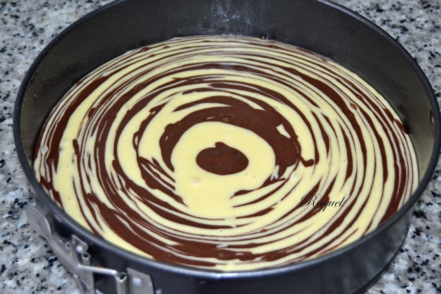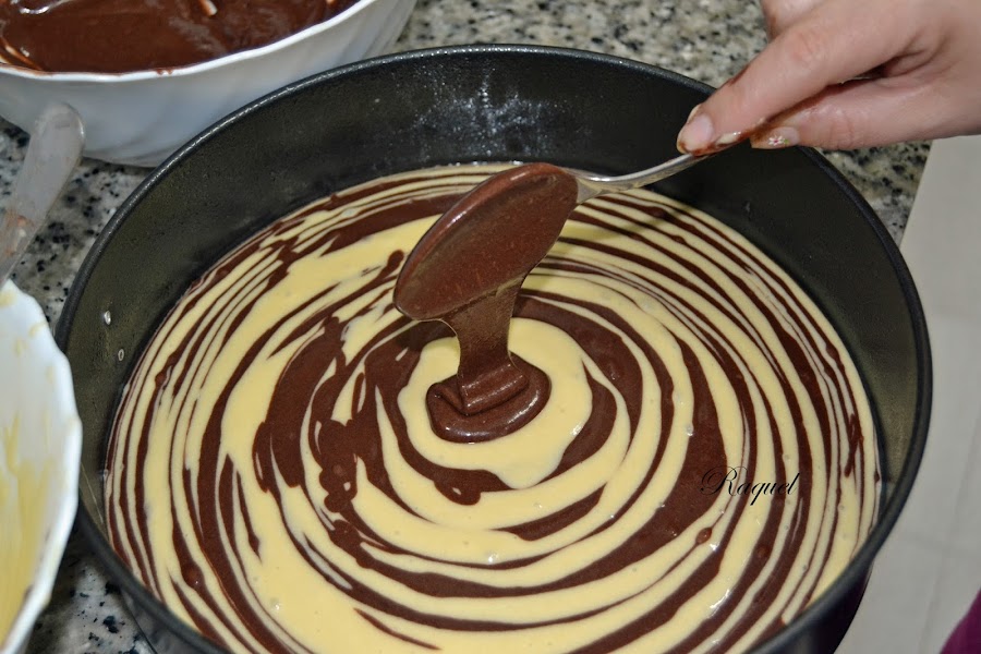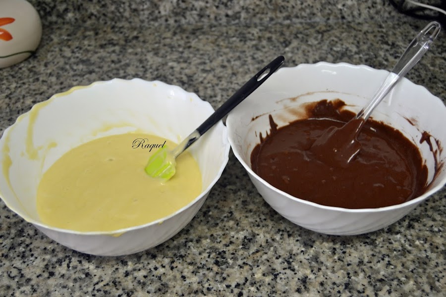 Echamos en el centro del molde una cucharada grande de la masa normal y a continuación la misma cantidad de la de chocolate.
