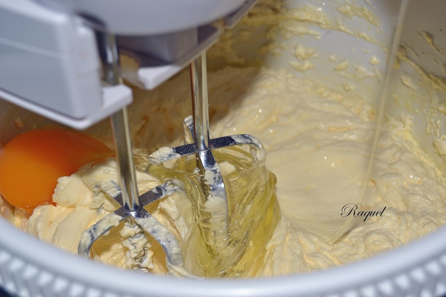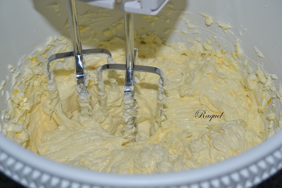 Ponemos en la batidora la mantequilla a temperatura ambiente y batimos durante dos minutos, echamos el azúcar y mezclamos durante tres minutos.