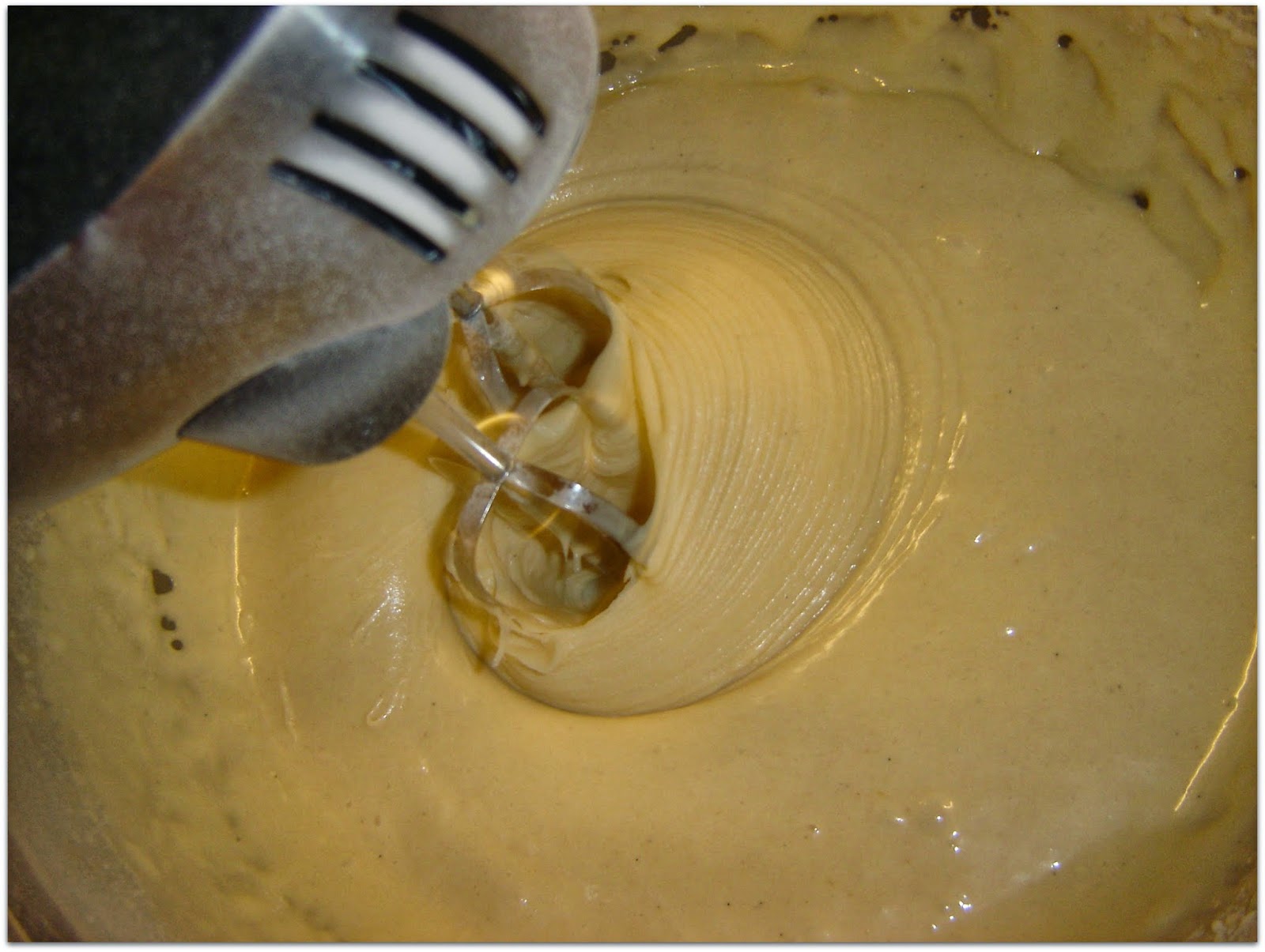 Batimos bien hasta que quede un aspecto cremoso como el de la fotografía. Vertemos el contenido en un molde previamente engrasado o con papel sulfurizado.