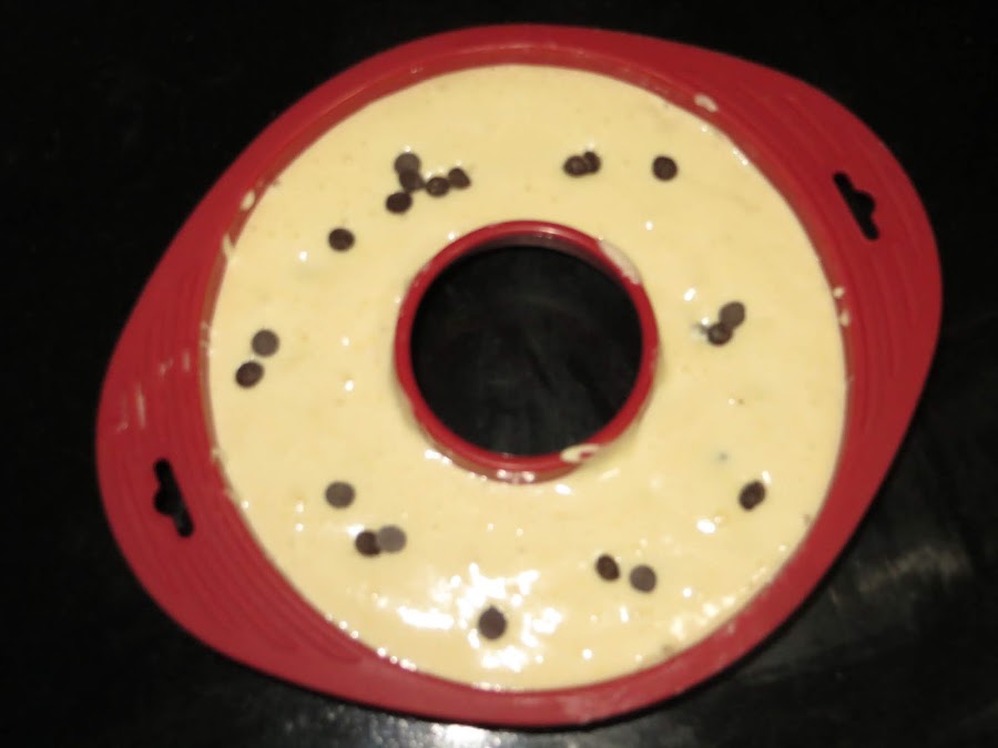 Luego añadimos poco a poco la harina tamizada y lo vamos mezclando. Finalmente añadimos las pepitas de chocolate y engrasamos un molde. Metemos al horno durante 30 minutos a 180º. Sacamos, pinchamos con un cuchillo para ver si está listo, dejamos que se enfríe, desmoldamos y ya está listo para comer, veréis lo esponjoso que queda.