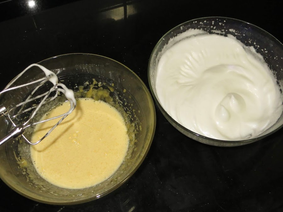 Separamos las claras y las yemas de los huevos. Por un lado batimos las yemas con 60 gramos de azúcar y por otro lado montamos las claras con los otros 60 gramos de azúcar. Luego juntamos las dos mezclas con movimientos envolventes para que no se nos baje la mezcla.