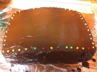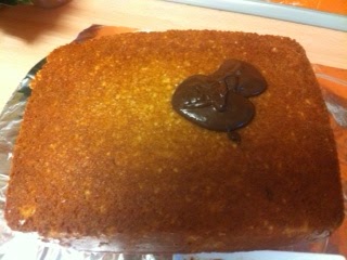 Para echar la cobertura al bizcocho yo lo pongo sobre un "pie" que tengo para que quede alto el bizcocho y pongo sobre la encimera papel albal para que no se manche todo y con ayuda de un cuchillo largo extiendo el chocolate por todo el bizcocho (no os olvidéis de los laterales) y pongo las bolitas de cereales.