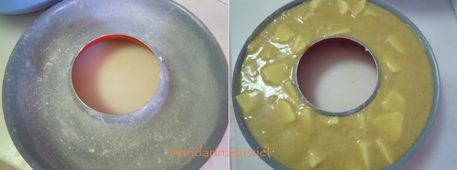 Coloca la mezcla en un molde untado de mantequilla y harina. Puedes utilizar cualquier molde, yo lo he puesto en uno circular.
