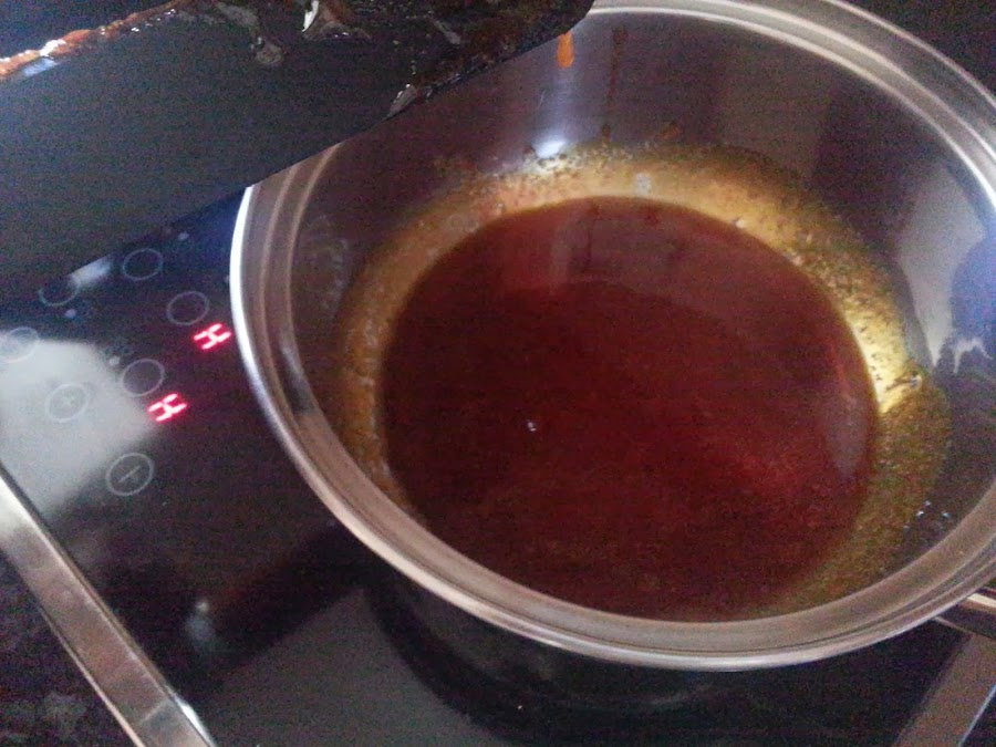 Ponemos los 200 gramos de azúcar en un cazo y calentamos hasta que se forme el caramelo.