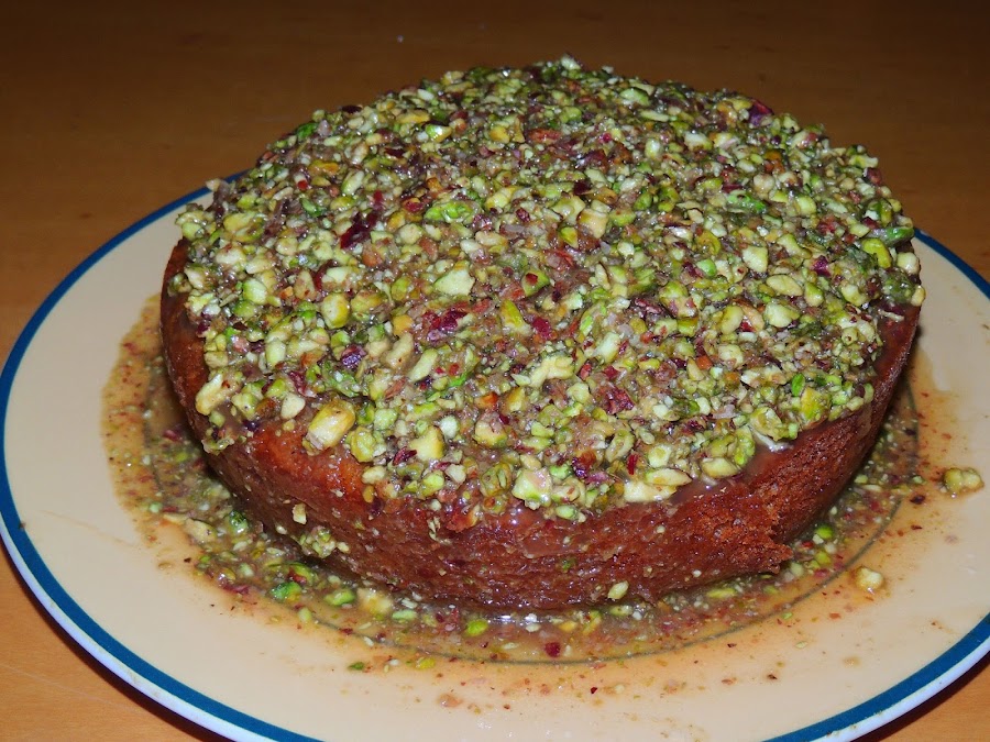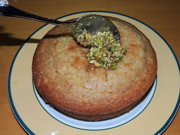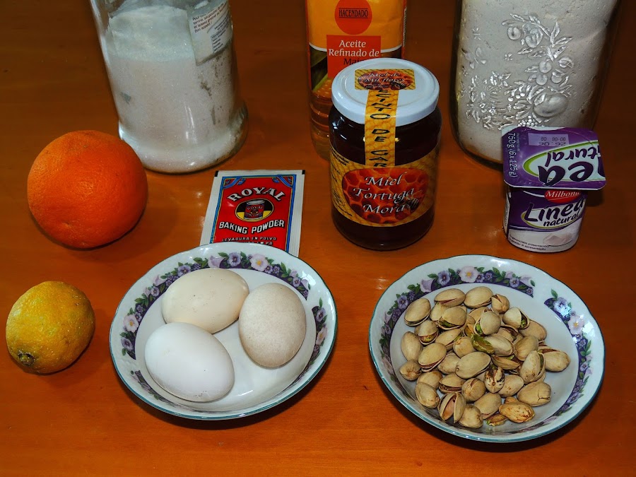 Para el bizcocho: Un yogur blanco, un vasito del yogur de aceite de girasol (el de oliva es demasiado fuerte y mata un poco el sabor del bizcocho), dos vasitos de azúcar, tres de harina, tres huevos y un sobre de levadura. Para el almíbar: Una naranja, un limón, 2 cucharadas colmadas de miel y 100 gr. de pistachos.
