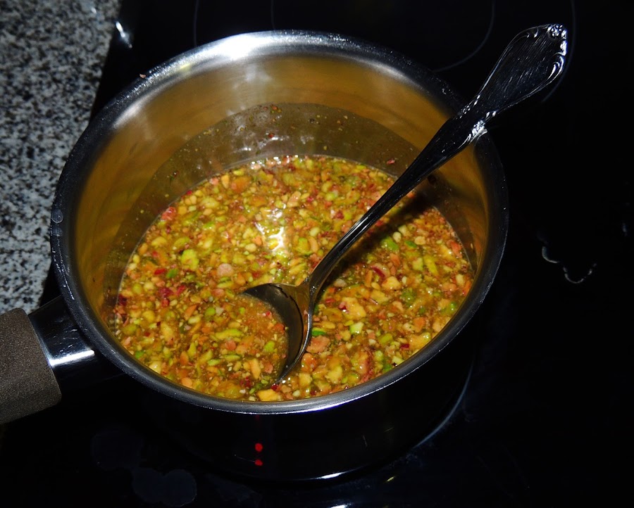 En un cazo, se pone a hervir el zumo, los pistachos y la miel.