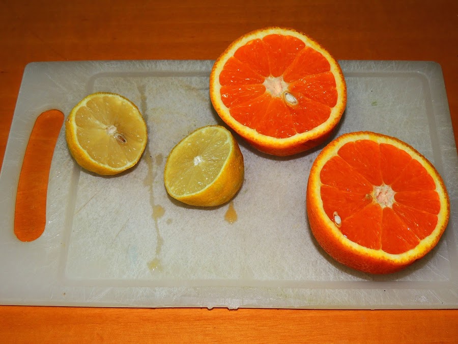 Con el horno ya caliente, se mete el bizcocho y se deja a esa temperatura unos 20 minutos. Luego se baja a unos 130º y se deja otros 30 minutos aproximadamente. Se pincha de vez en cuando con un palito de brocheta para ver si está hecho por dentro, pero no abráis demasiado el horno porque si no, el bizcocho no sube. Mientras tanto, se cortan en dos la naranja y el limón.