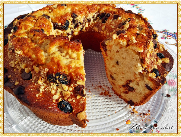 Engrasar la cubeta, echar la mezcla, repartir por encima unos trocitos de avellana, unas pasas y unas gotas de chocolate. Cerrar con válvula abierta menú cake. Cuando termine ponerle el cabezal de asar y tostar a 180º unos 10 minutos mas.