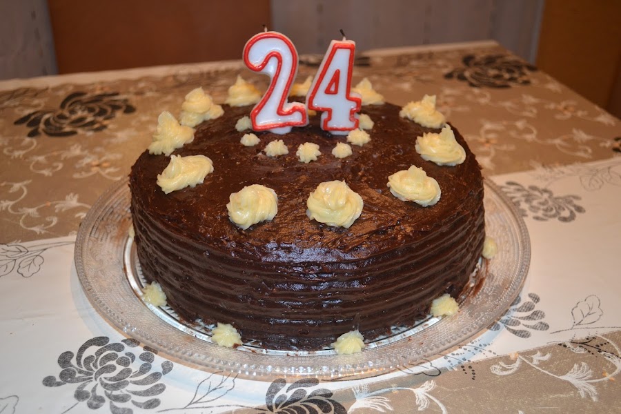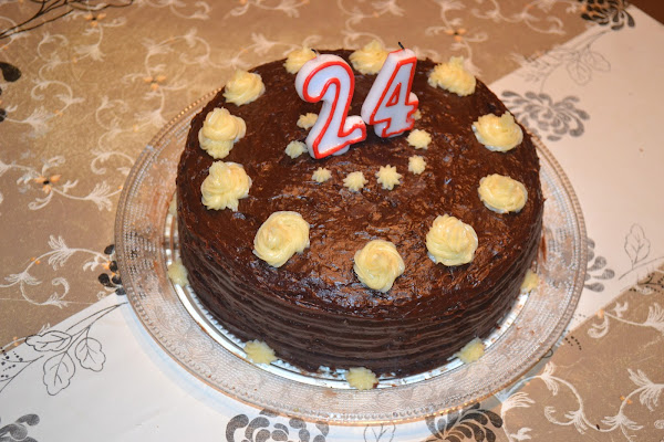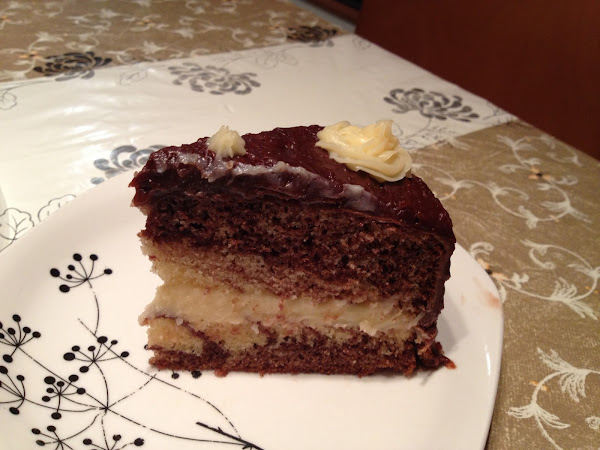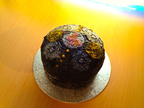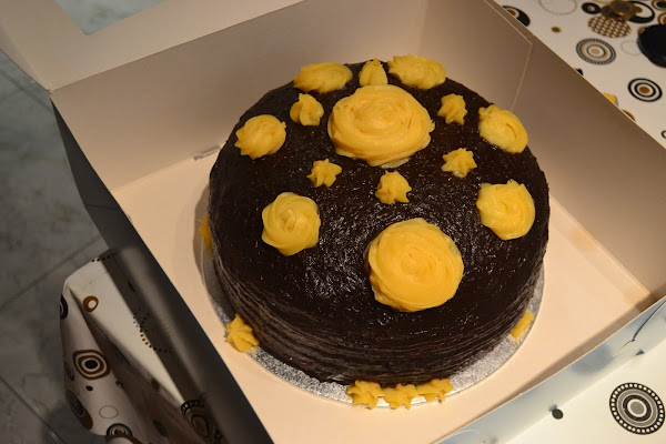 El relleno es de crema, como el del pastel de mi hermano. Decorado con rosas (o un intento - era la primera vez que empleaba esta técnica- ) que hice con la boquilla 1M de Wilton. Desafortunadamente, no giré la manga pastelera en el sentido adecuado, que es el de las agujas del reloj, como he aprendido con el libro "Objetivo: Tarta Perfecta" de Alma Obregón".