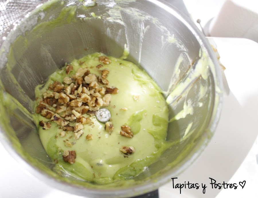 Incorporamos la harina y la levadura y mezclamos 20 segundos a velocidad 4. Por ultimo agregamos las nueces picaditas y mezclamos 10 segundos a velocidad 3. Todo esto lo podemos hacer con una batidora eléctrica.