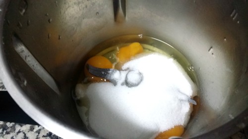 - Ponemos los huevos y el azúcar en un recipiente, y batimos.