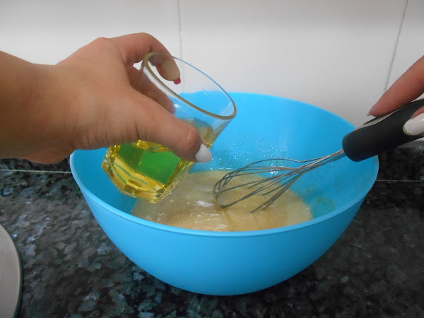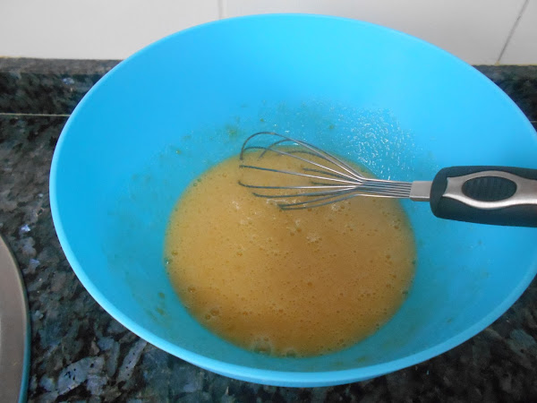 Ponemos en un cuenco los huevos y el azúcar, batimos con las varillas hasta que hayan blanqueado.