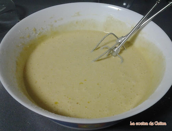 A esta mezcla le incorporamos la almendra molida, la ralladura de limón y la canela, movemos con las varillas durante unos segundos, y por último incorporamos la harina, la maicena y el royal, batimos de nuevo para mezclarlo todo bien y vertemos la masa en un molde untado con mantequilla.