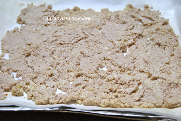 Empezamos extendiendo la pasta de almendras sobre papel sulferizado en una bandeja de horno; encendemos el horno y lo dejamos unos 15 minutos a 160 grados.