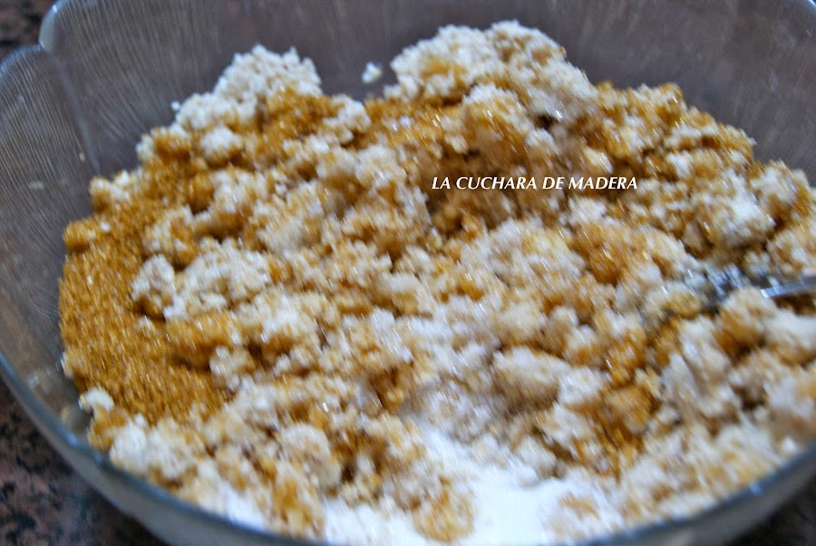Sacamos del horno y lo colocamos en un bol junto con los dos tipos de azúcares y removemos.Dejamos el horno encendido a 180 grados para después meter la masa.