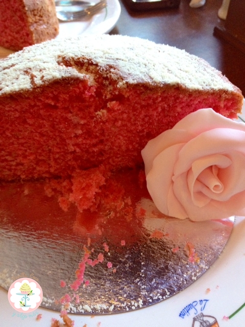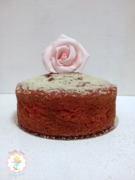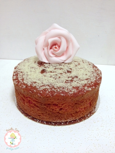 No la rellené porque me apetecía un bizcocho así tal cual. Lo decoré con un poquito de almendras molidas y una rosa de fondant.