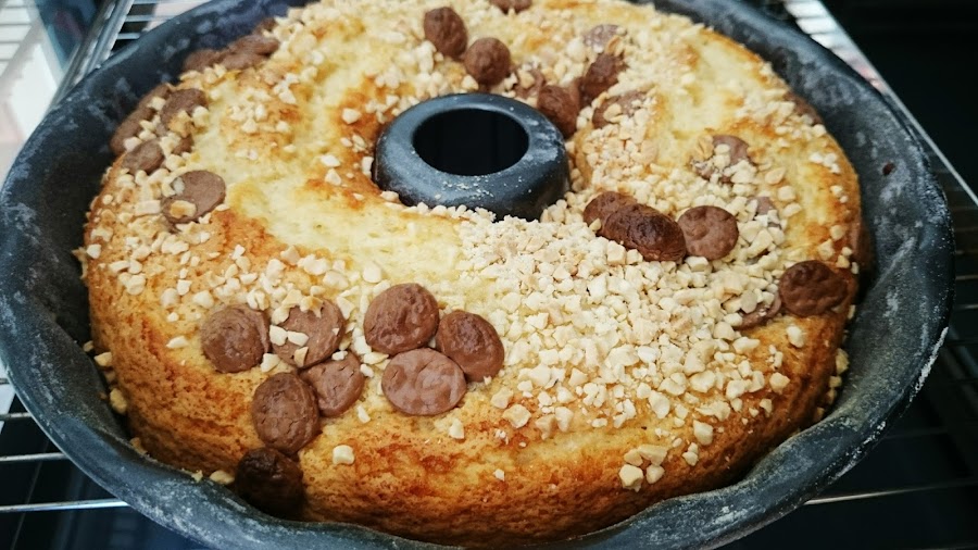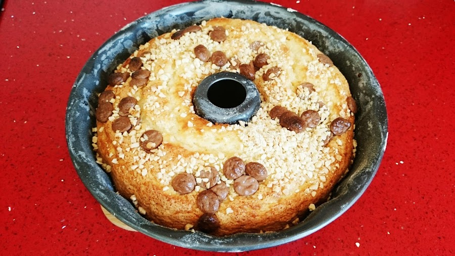 Cuando este a medio hornear le añadimos los 50 gr de almendras y las pepitas de chocolate.