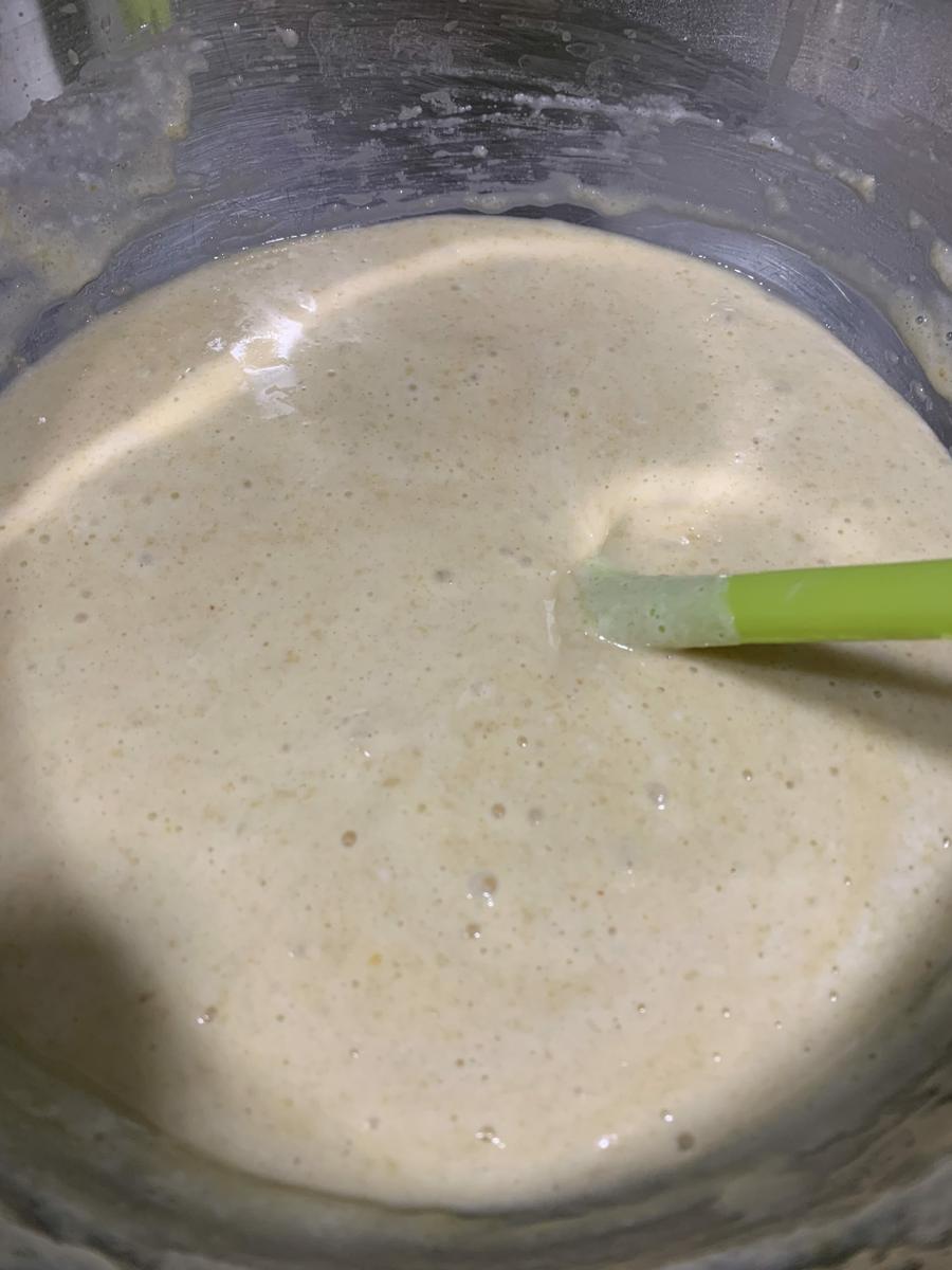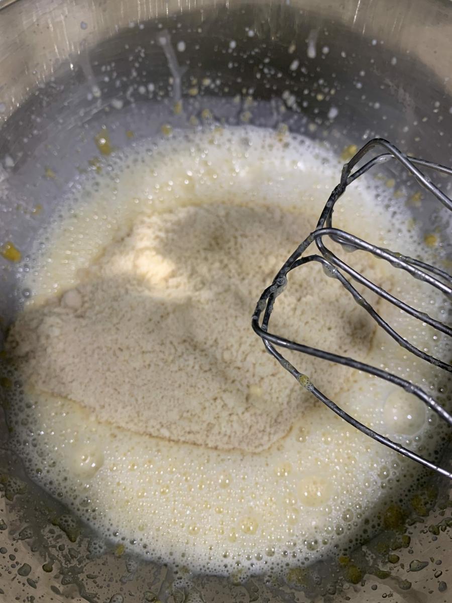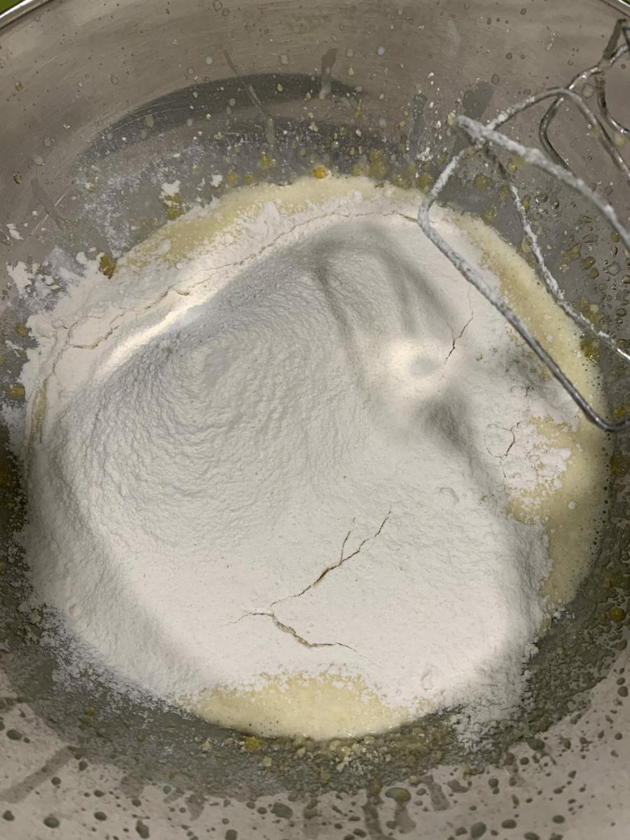 Añadimos el aceite y batimos otra vez. Ponemos las leche y volvemos a mezclar. Después añadimos las harina de almendras. Y por ultimo añadimos la harina y la levadura tamizadas. Entonces reservamos esta mezcla.