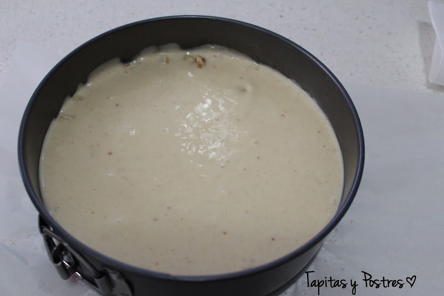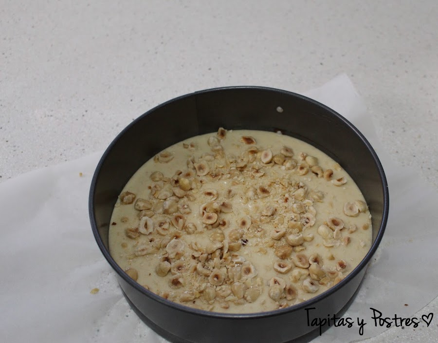 Ponemos la mitad de la masa en un molde desmoldable. este es de 23 cm. Encima ponemos avellanas picadas.