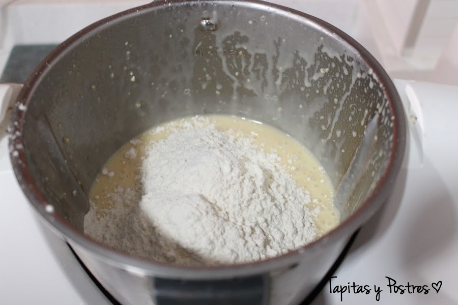Añadimos la harina y la levadura y mezclamos 30 segundos a velocidad 4.