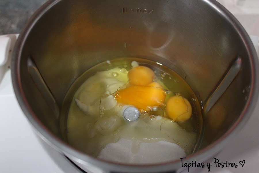A continuación ponemos los huevos, los yogures, el aceite y el azúcar y batimos 30 segundos a velocidad 5.
