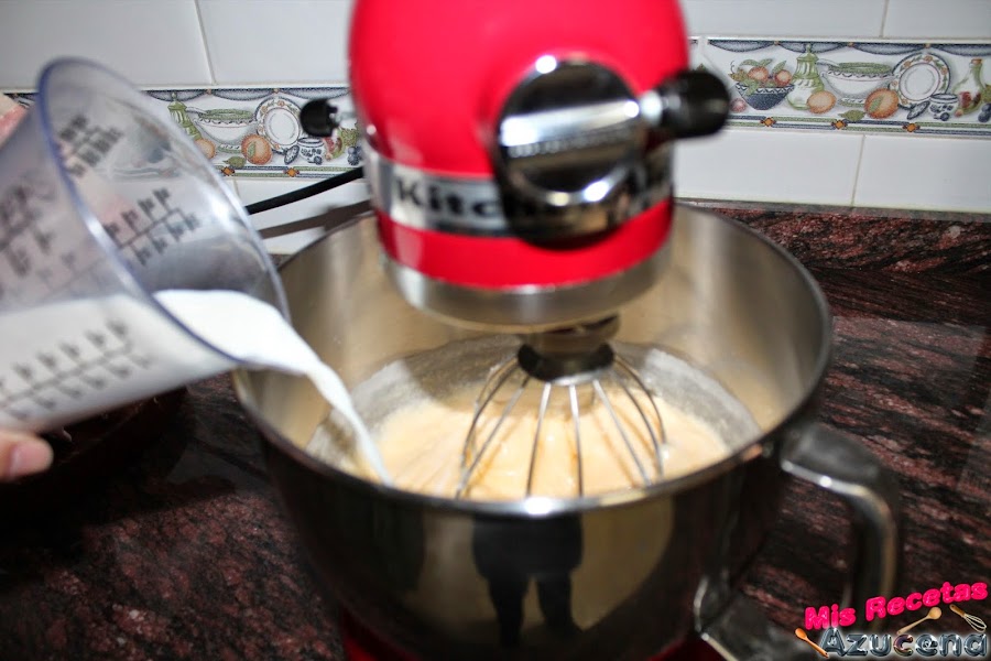 Ya solo nos falta añadir la harina que la iremos añadiendo poco a poco, una vez la tengamos añadida batiremos un minuto más y pararemos.