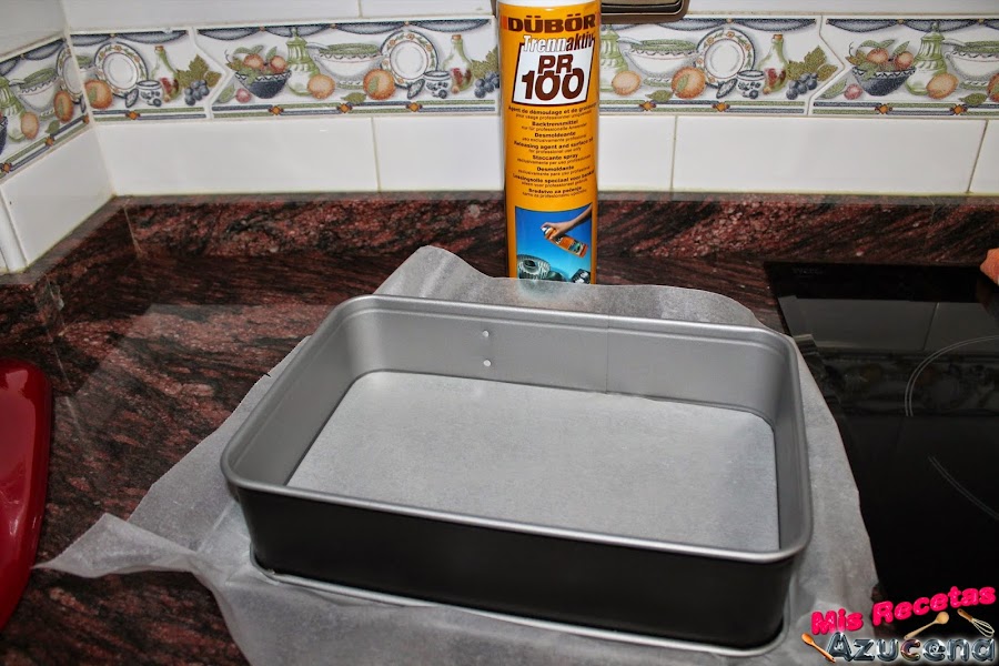 Ahora cogeremos nuestro molde y le pondremos papel vegetal en la base y spraydesmoldante por los lados, si no tenemos spray lo podemos hacer como siempre untando mantequilla y espolvoreando un poco de harina, el monde que yo he utilizado es de 28x19, una vez lo tengamos listo pondremos la masa, le daremos unos golpecitos para que se nivele la masa y lo metemos en el horno y lo dejaremos durante 45 minutos.