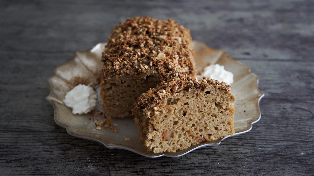 Para el crumble: en un bol ponemos los copos de avena, la mantequilla fundida, el café soluble y la canela y mezclamos bien con las manos.