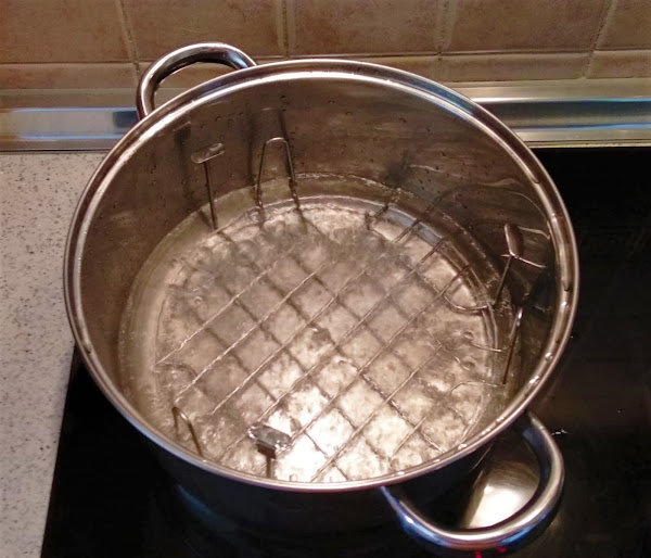- Preparamos el "baño maría" : Cogemos una cazuela ancha y alta, metemos dentro la rejilla del microondas y llenamos hasta la mitad con agua.