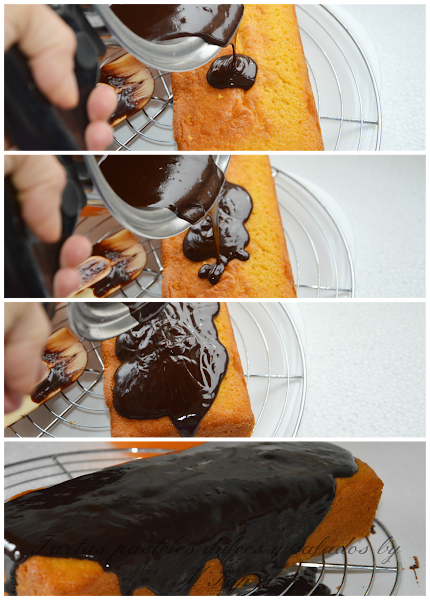 Una vez frió el bizcocho, colocamos un plato debajo de la rejilla y echamos el chocolate encima , dejando caer poco a poco