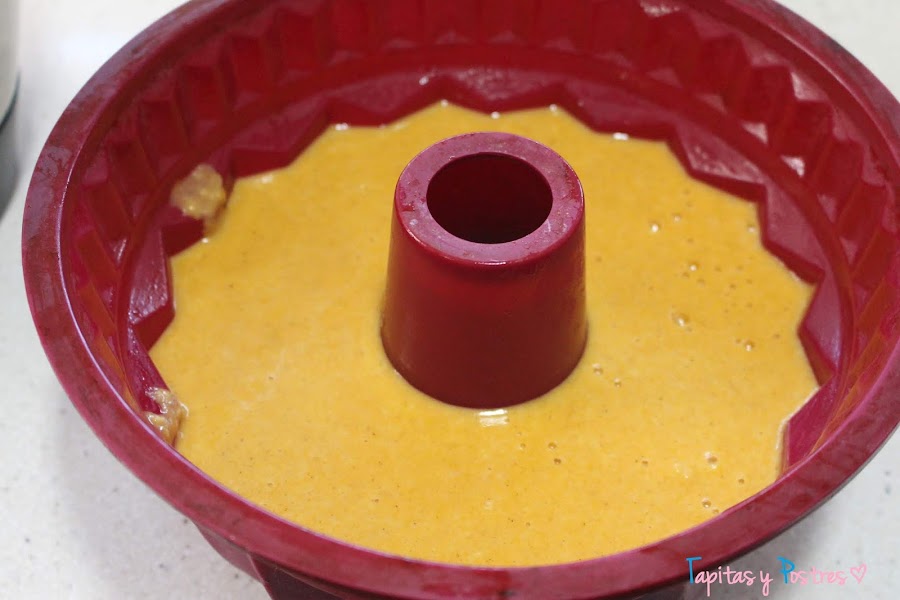 Agregamos la canela, los huevos y la levadura. Batimos 30 segundos a velocidad 4. Vertemos esta mezcla en un molde engrasado. Yo he usado un molde de silicona.
