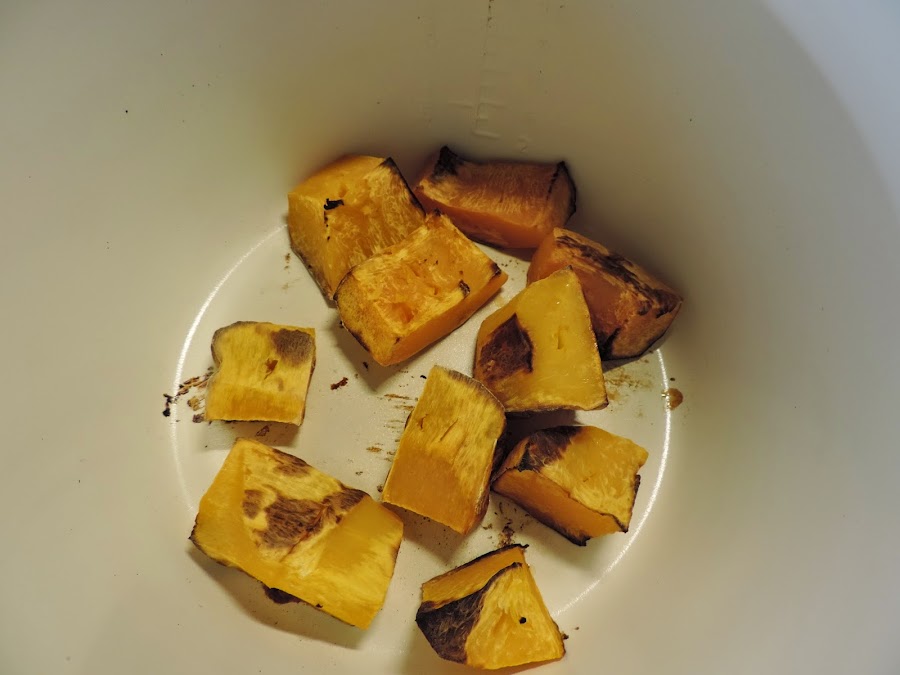 Primero asamos la calabaza, la ponemos cortada en trozos pequeños en la cubeta de la olla.