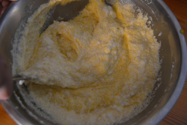 Mezclamos la harina con la almendra molida, la pizca de sal, la canela y la levadura y la añadimos a las yemas.