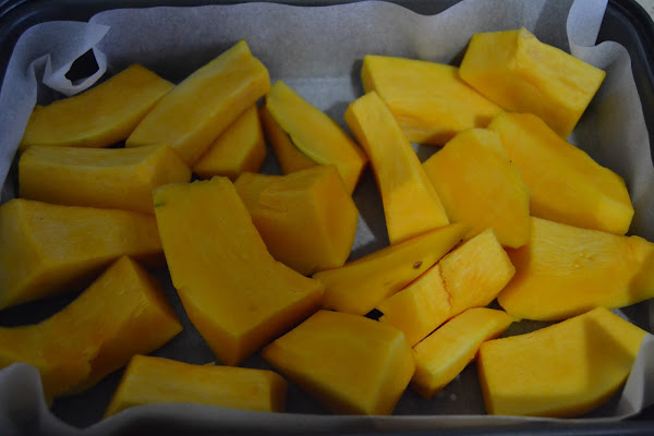 Ponemos unos 800 grs. de calabaza al horno en trozos hasta comprobar que esta tierna, sacamos y dejamos enfriar.