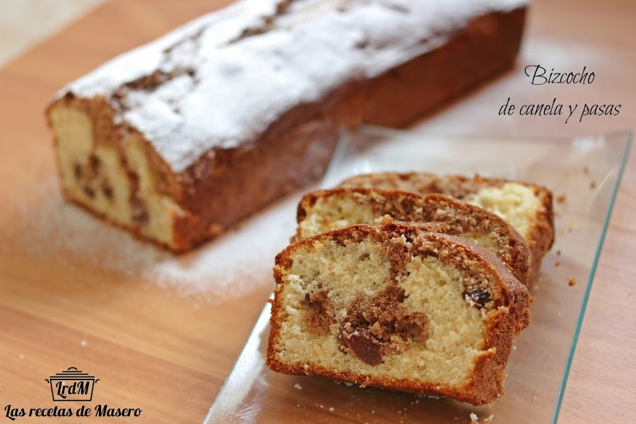 Ponemos unos 200 g. de la masa en un cuenco pequeño y añadimos la canela, removiendo. Añadimos las pasas a la masa restante y después vertimos en el molde preparado. Ponemos la masa con canela por encima y mezclamos un poco las dos masas para conseguir el efecto marmolado.