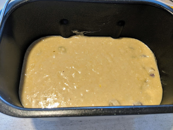 Mezclamos con una lengua de silicona, con movimientos envolventes de abajo a arriba. Añadimos la mitad de las cerezas y volcamos en la cubeta de la panificadora