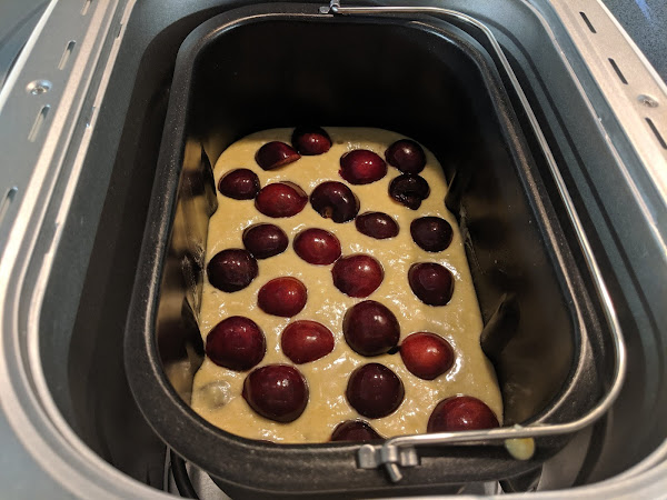 Anclamos la cubeta a la máquina.y repartimos con cuidado las cerezas que quedan por la superficie. Haciéndolo así las cerezas quedan distribuidas por todo el bizcocho, no solo en el fondo