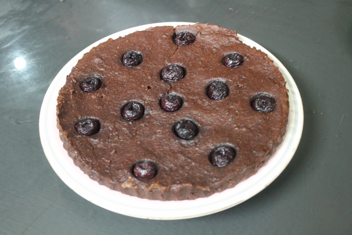 Colocamos la masa en un molde de silicona, alisamos su superficie y la decoramos con las cerezas.