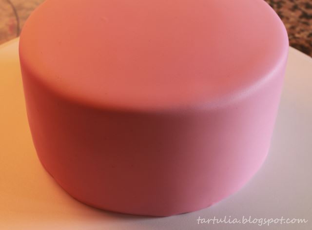 La tarta fue surgiendo poco a poco, busque un color sobre el que destacar las flores y me decidí por un rosa Claret de Sugarflair, teñí el fondant y cubrí la tarta que había rellenado y cubierto íntegramente con el ganache de chocolate blanco (receta aqui) Hice un lazo también en blanco y negro, igual que las rosas, que deje secar y rodee la tarta de una cinta de fondant también en esos colores.