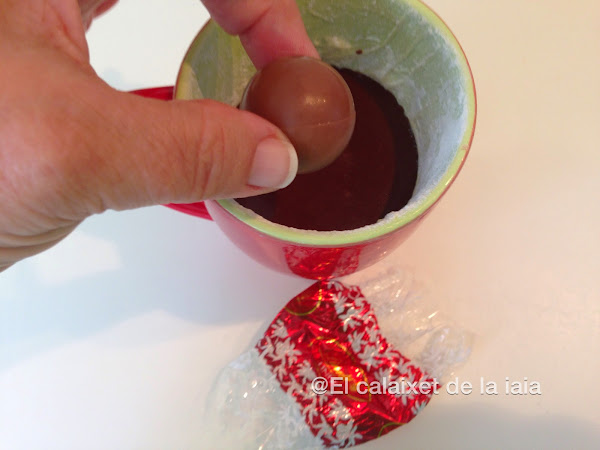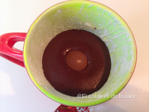 Volcamos en la taza la mezcla y ponemos en el centro un bombón,