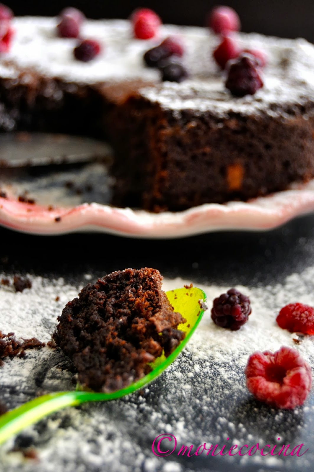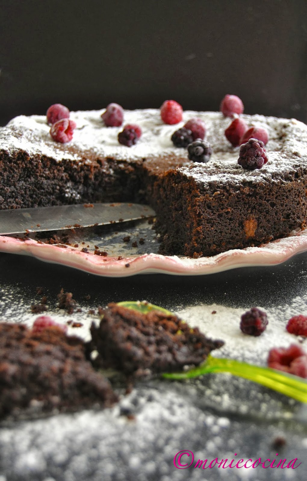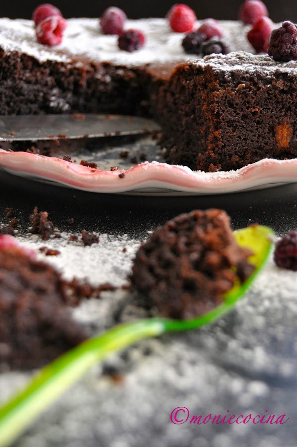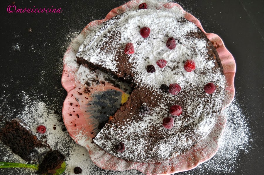Sacamos, dejamos reposar unos minutos y desmoldamos. Yo simplemente espolvoreo con azúcar glas y en este caso con unos frutos rojos que tenía a mano.
