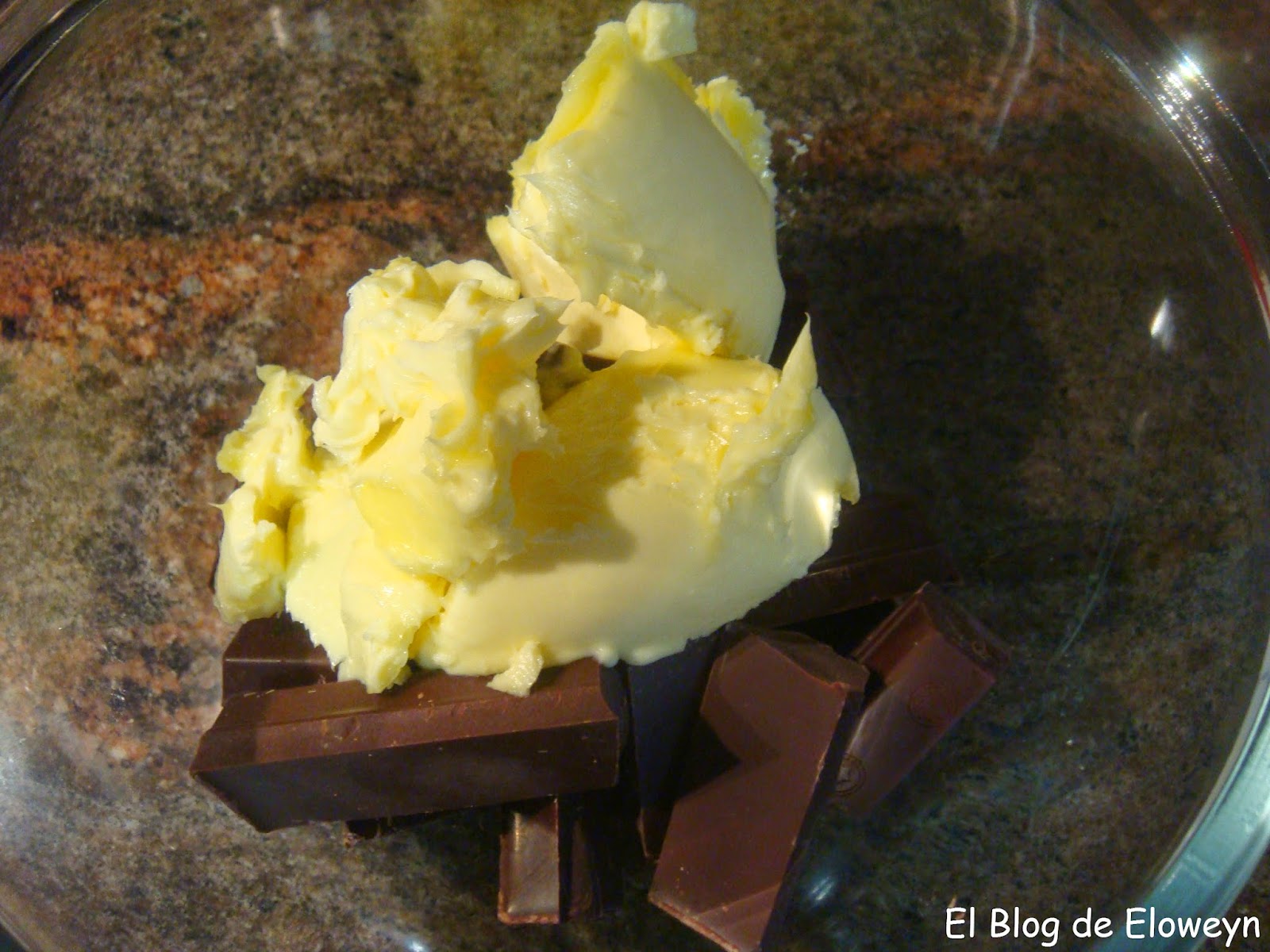 Poner el bol con el chocolate y la mantequilla en el microondas. Seleccionamos la opción "Descongelar". Programamos unos dos minutos. Lo hacemos de esta forma para evitar que se queme. Una vez pasados estos dos minutos, sacar el bol del microondas y remover para ir deshaciendo el chocolate. Si vemos que no se ha fundido del todo, lo volvemos a poner en el microondas unos 30 segundos, con la misma opción de descongelar. Una vez haya acabado el tiempo, removiendo ya se debería de haber acabado de fundir. Si no es así, repetir esta operación 30 segundos más (no creo que sea necesario).