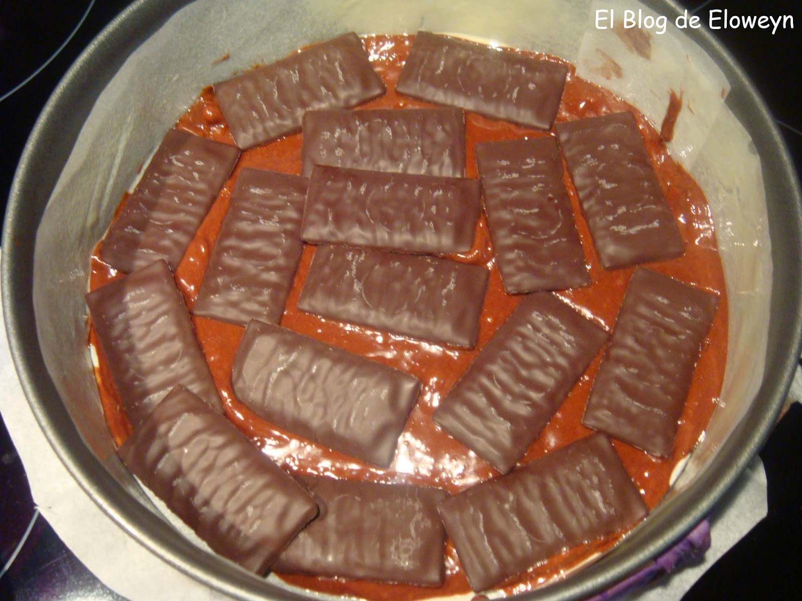 Verter la mitad de la mezcla en el molde y aplanar con una espátula para que quede uniforme. Añadir las tabletitas de after eight.