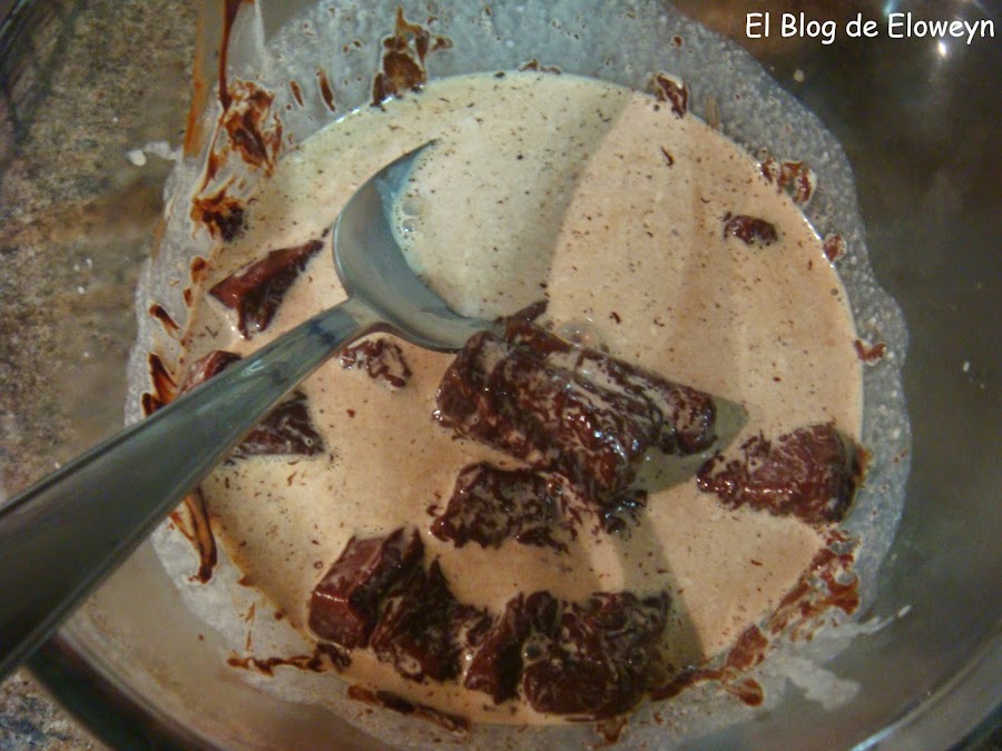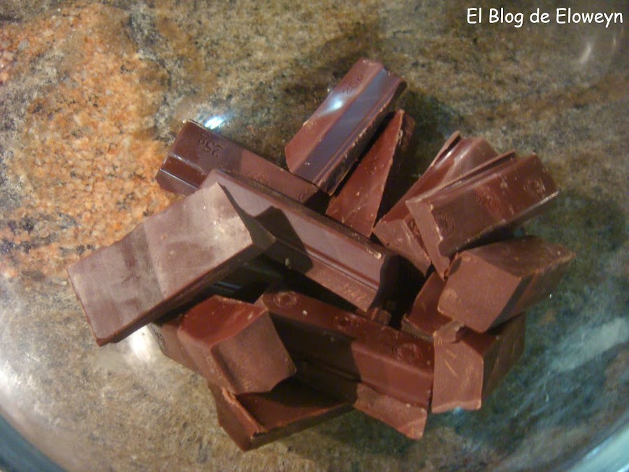 Partir el chocolate en trocitos (más pequeños que los de la foto. A mi me costó derretir el chocolate porque eran demasiado grandes). Ponerlos en un bol.