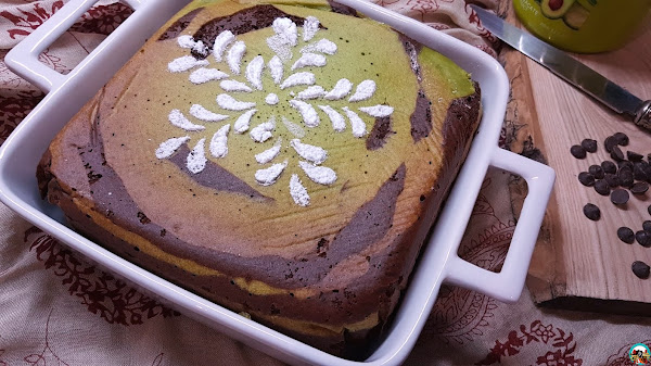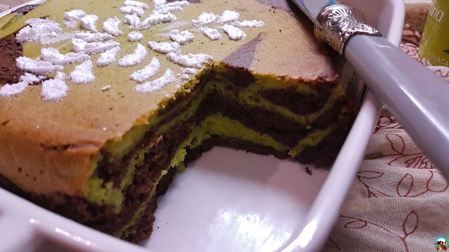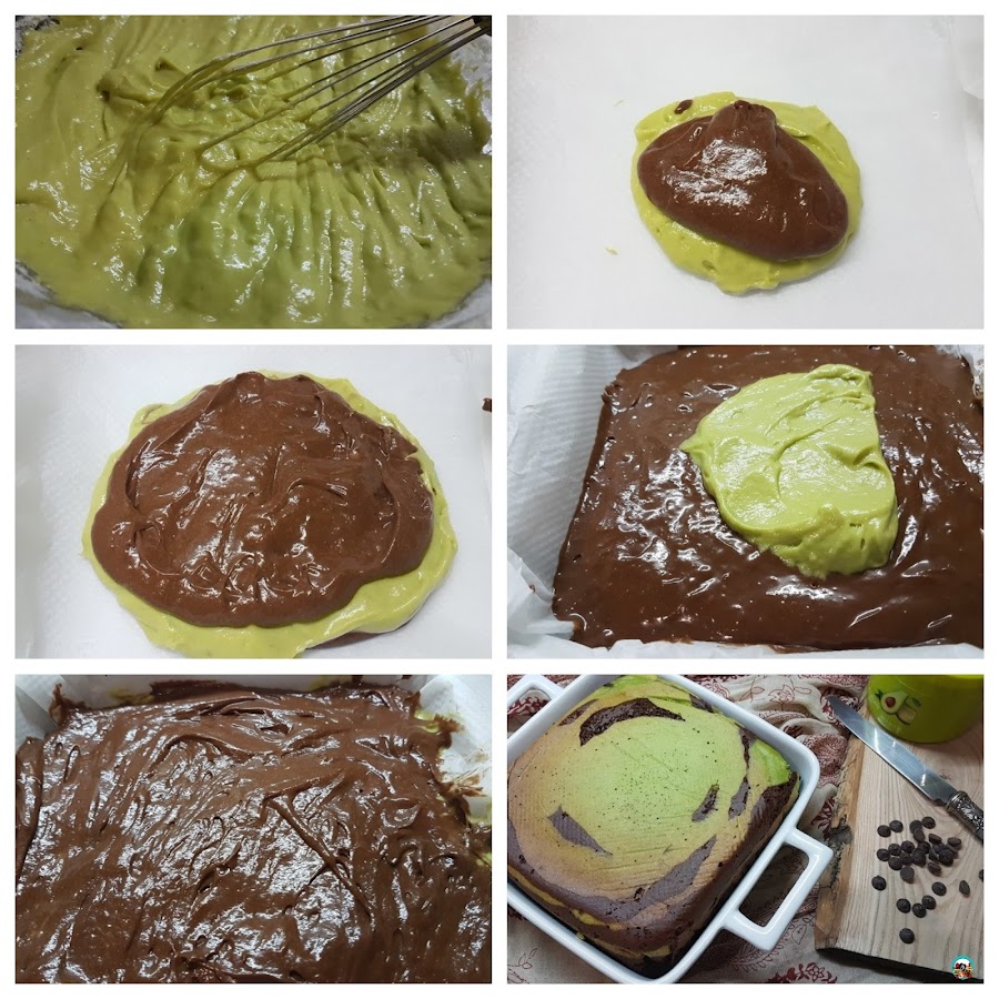 3.- Forramos un molde con papel de horno. Con una cuchara añadimos un poco de masa de aguacate: disponemos sobre la masa de aguacate unas cucharadas de masa de chocolate. Repetimos la operación hasta llenar el molde y acabar con la masa. Cocinamos el bizcocho 35 o 40 minutos con el horno precalentado a 180º.