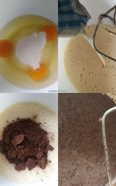 ELABORACIÓN: En un bol, ponemos los huevos con el azúcar y batimos hasta que blanqueen. Posteriormente añadimos la nata (crema de leche) y mezclamos, pondremos la harina tamizada y mezclamos. Y por último el cacao, la vainilla y el agua de azahar.