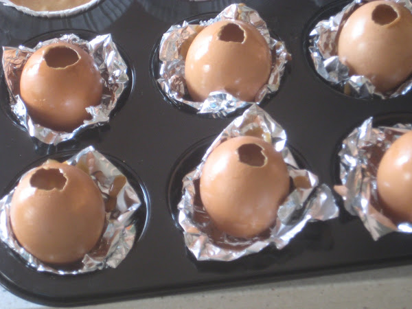 Cogeremos las cáscaras de huevo y le echamos aceite y lo vamos girando para engrasar toda la superficie interna. Después ponerlos en una bandeja de magdalenas forrados con papel de aluminio y también en los agujeros para dar estabilidad al huevo y que el agujero quede arriba de todo y bien firme.